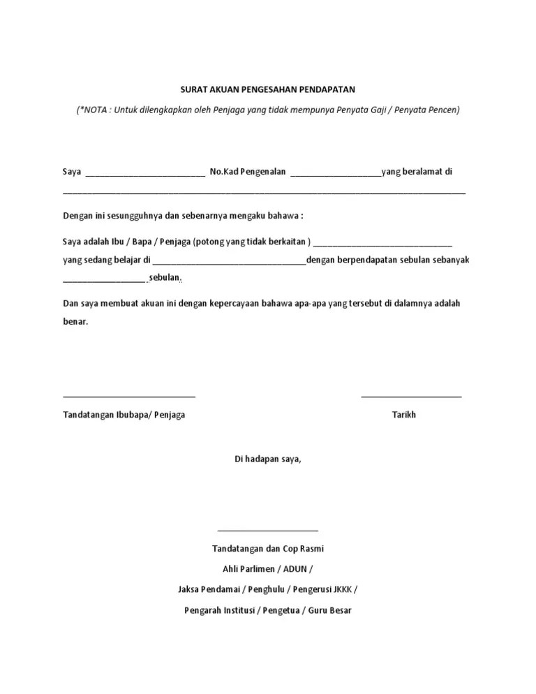 Pengesahan dari ketua kampung / ketua penduduk / pesuruhjaya sumpah. Contoh surat akuan sumpah isteri tidak bekerja. Surat akuan pengesahan pendapatan saya. Contoh surat akuan sumpah bagi ibu yang tidak bekerja. Contoh surat akuan bujang yang . Contoh surat izin bekerja dari suami surat 6 cute766. Namun tidak semua pemohon bekerja dengan majikan dan. 14 contoh surat pengesahan pendapatan tanpa slip gaji. Lakukan carian di internet perkataan "pesuruhaya sumpah" dan anda akan ditunjukkan lokasi pesuruhjaya sumpah . D isteri yang membuat sumpah lian akan terlepas daripada hukuman rejam sampai mati.